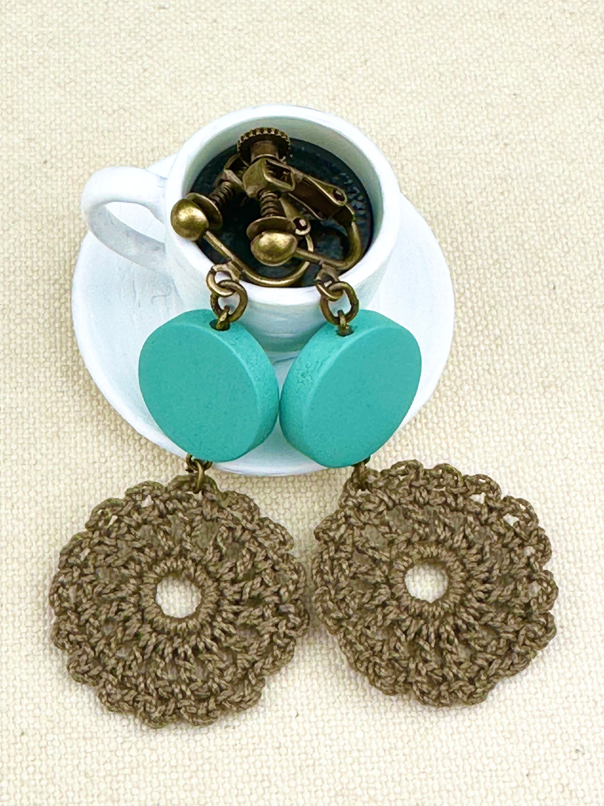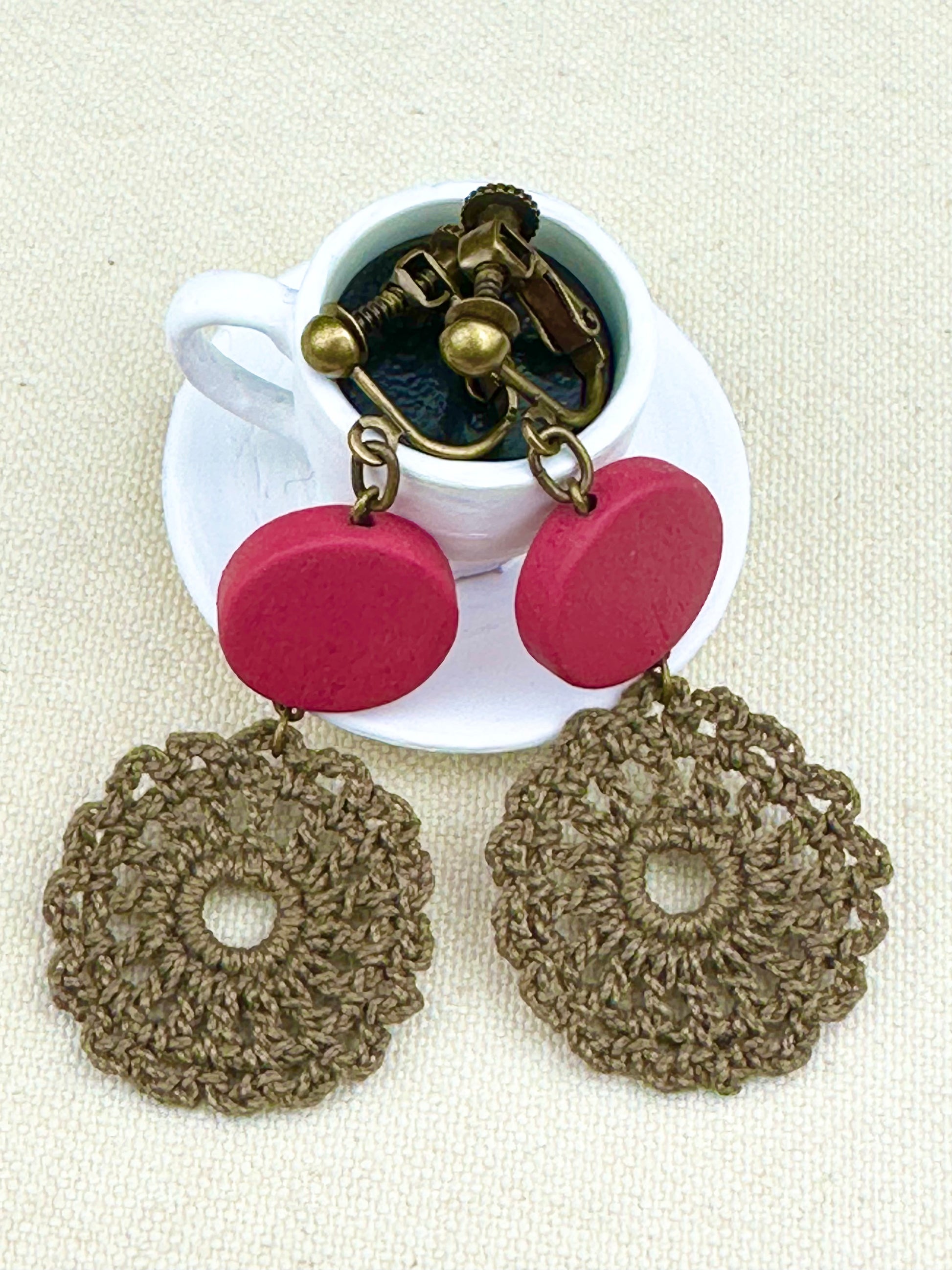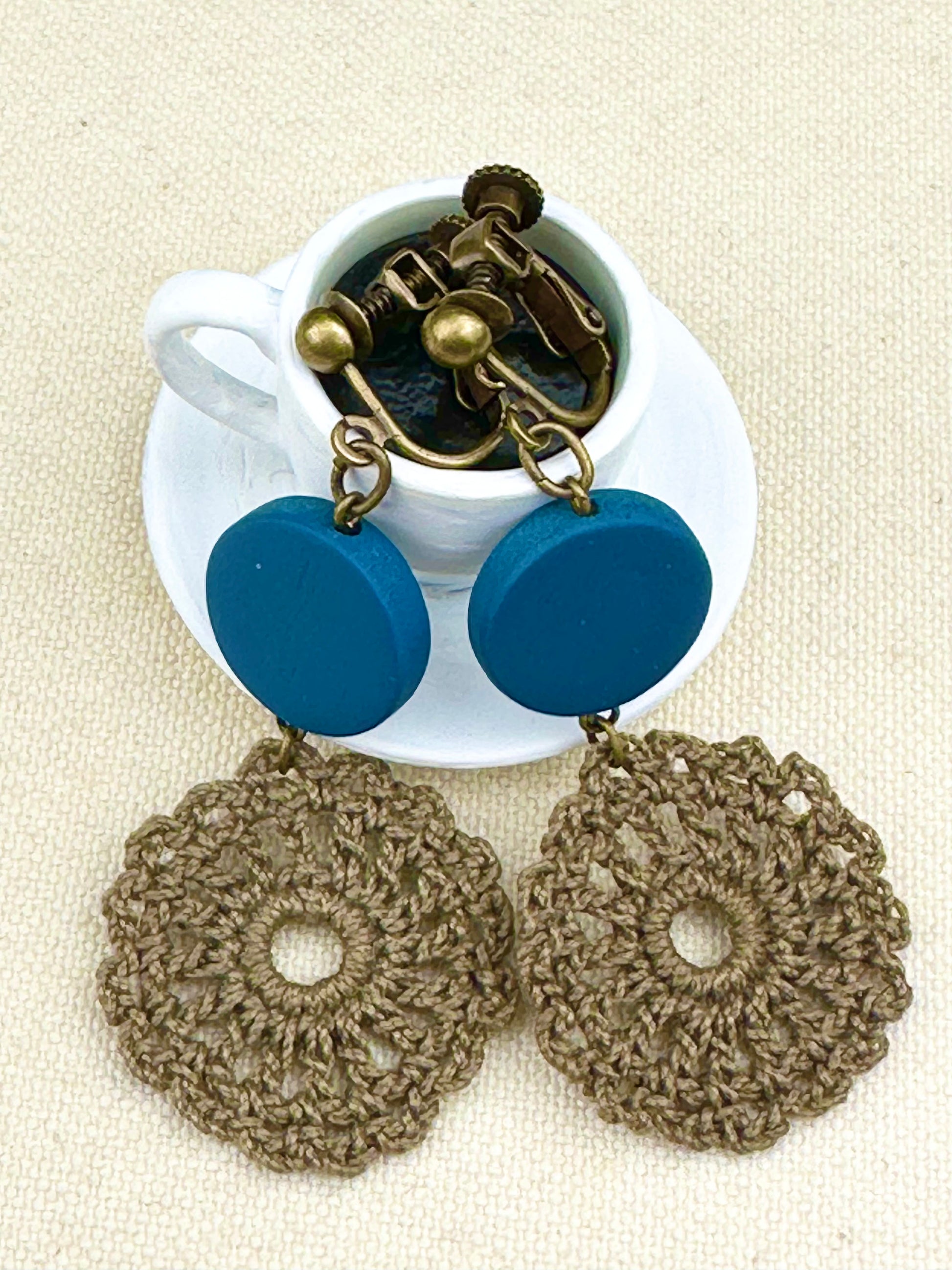 デュアルリング珈琲で染めたレースをあしらえたイヤリングです。