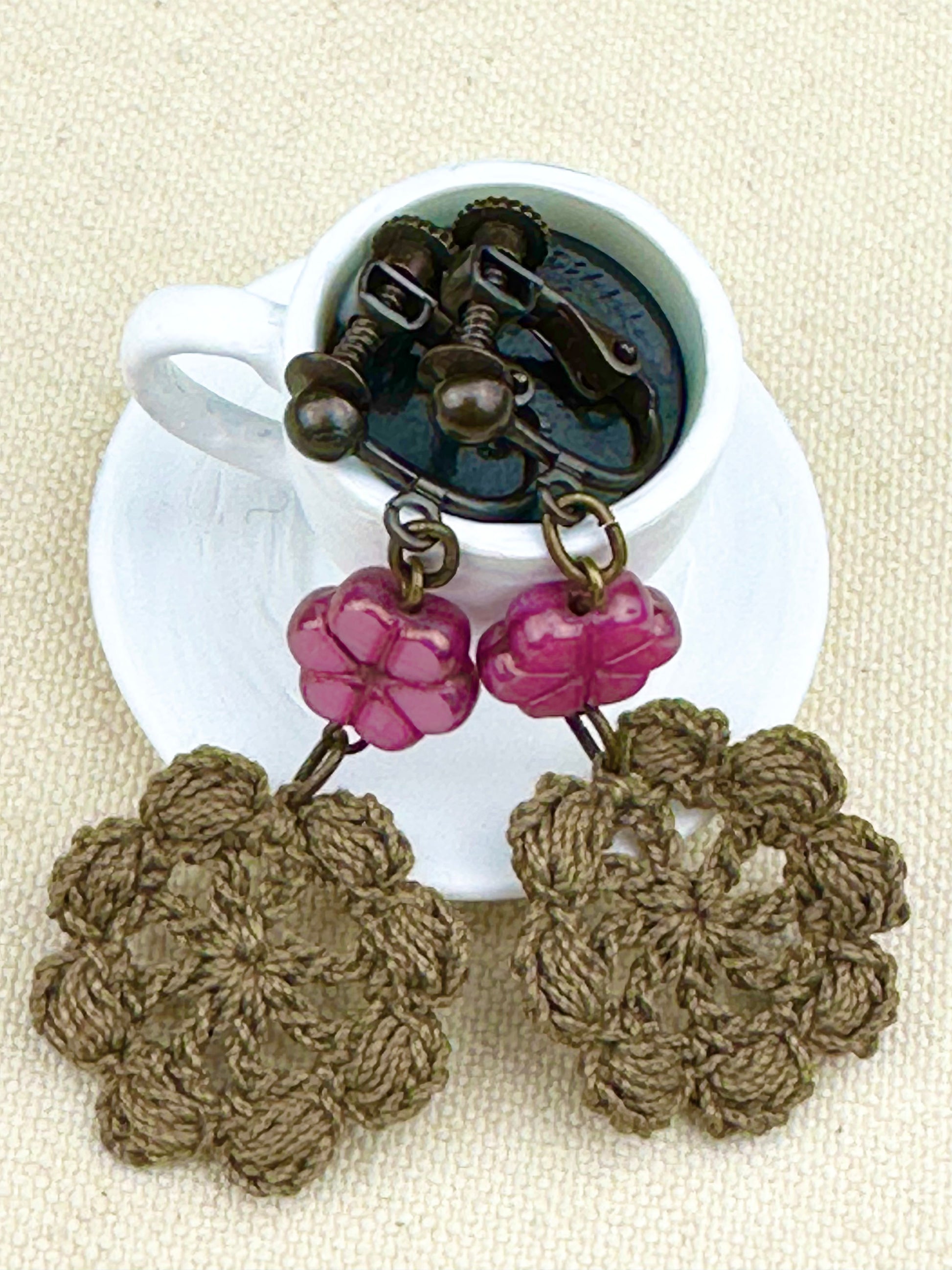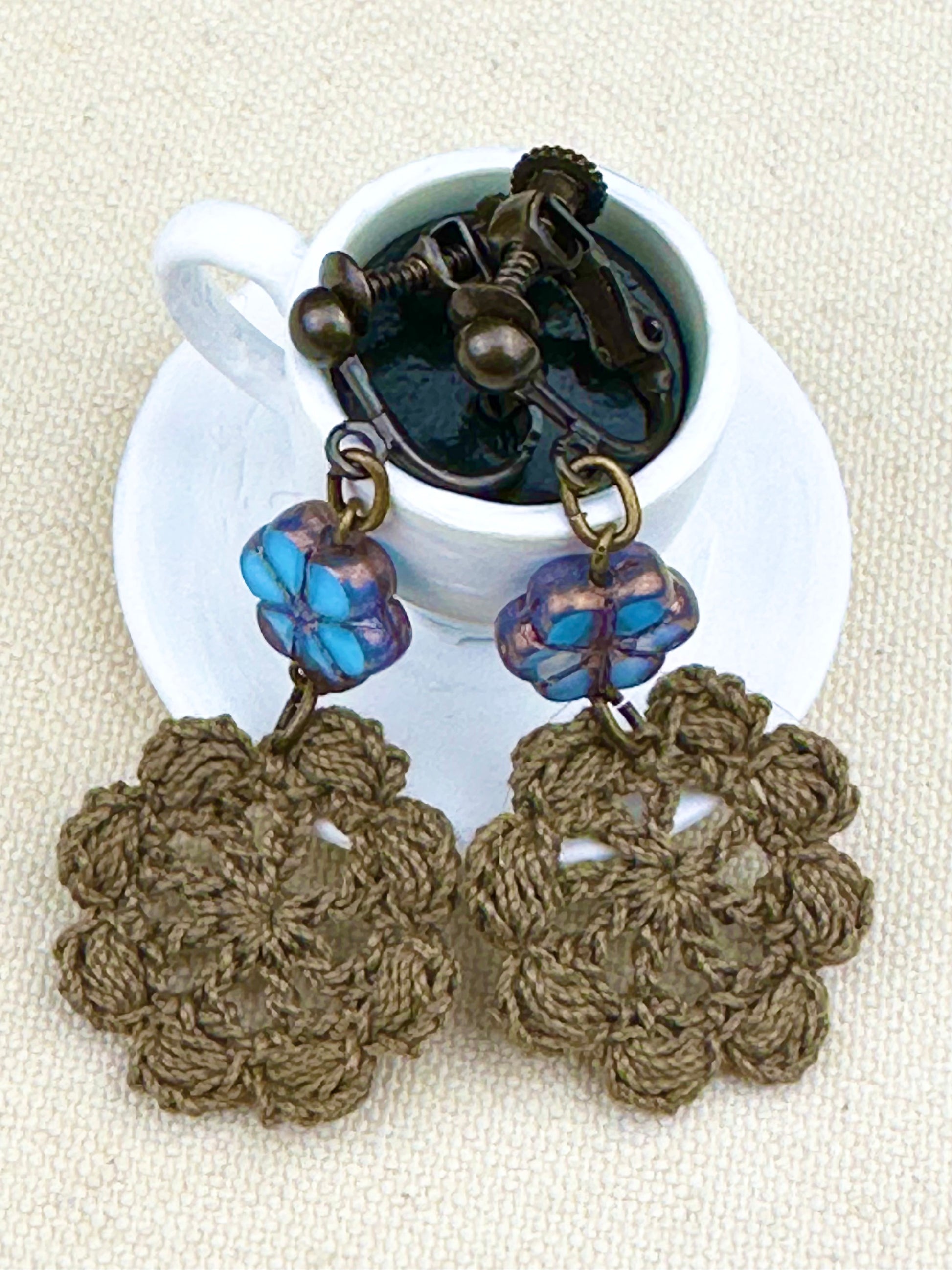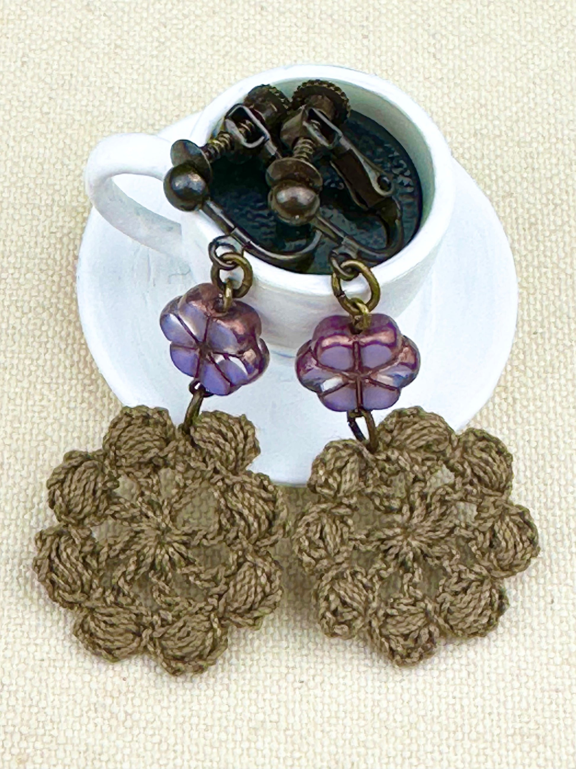 デュアルリング珈琲で染めたレースをあしらえたイヤリングです。