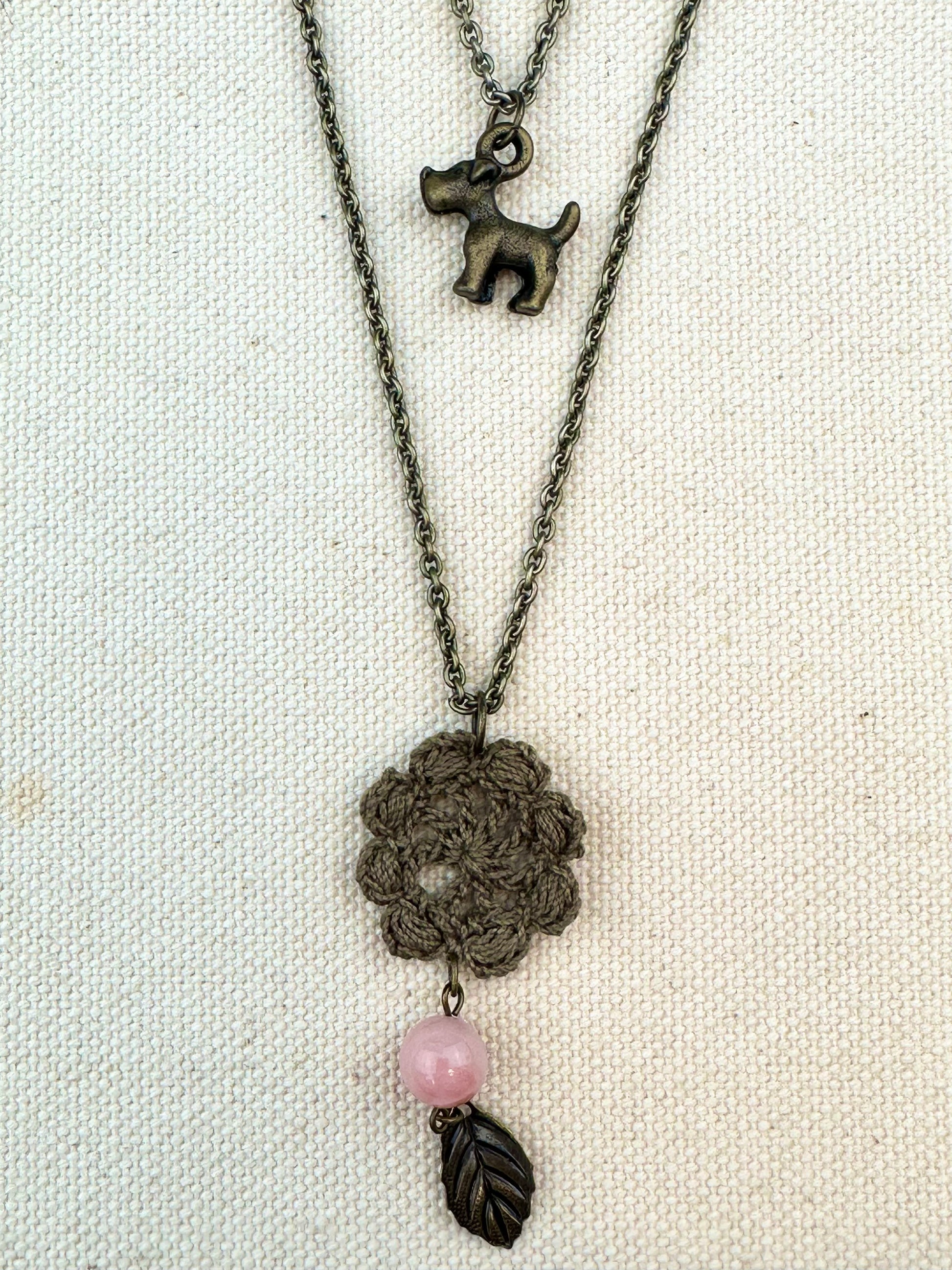デュアルリング珈琲で染めたレースをあしらえたネックレスです。