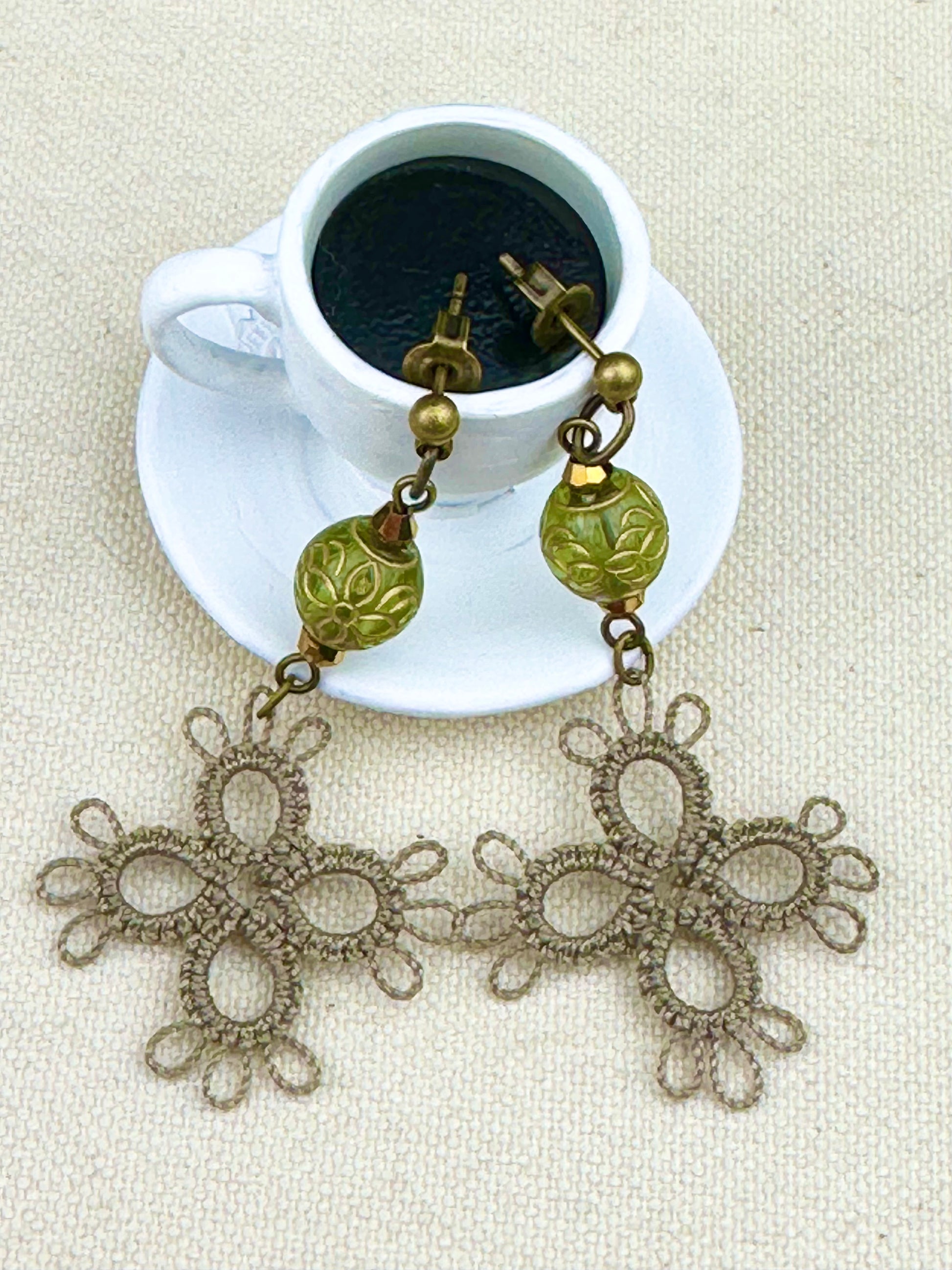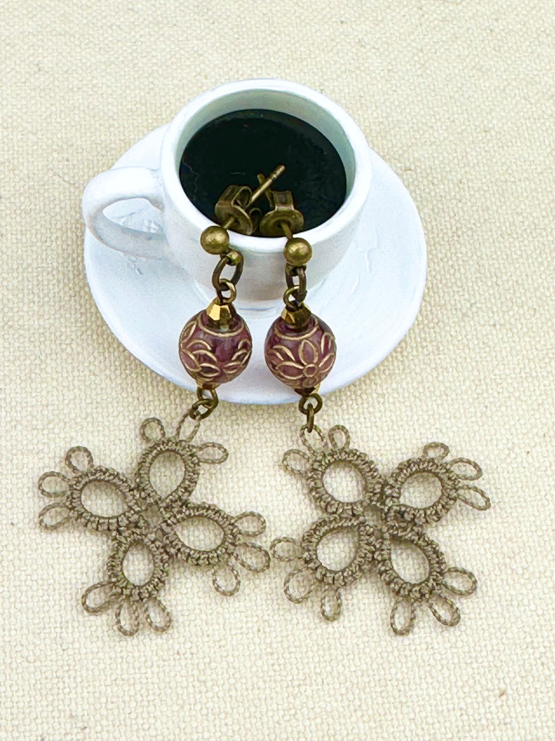 デュアルリング珈琲で染めたタティングレースをあしらえたピアスです。