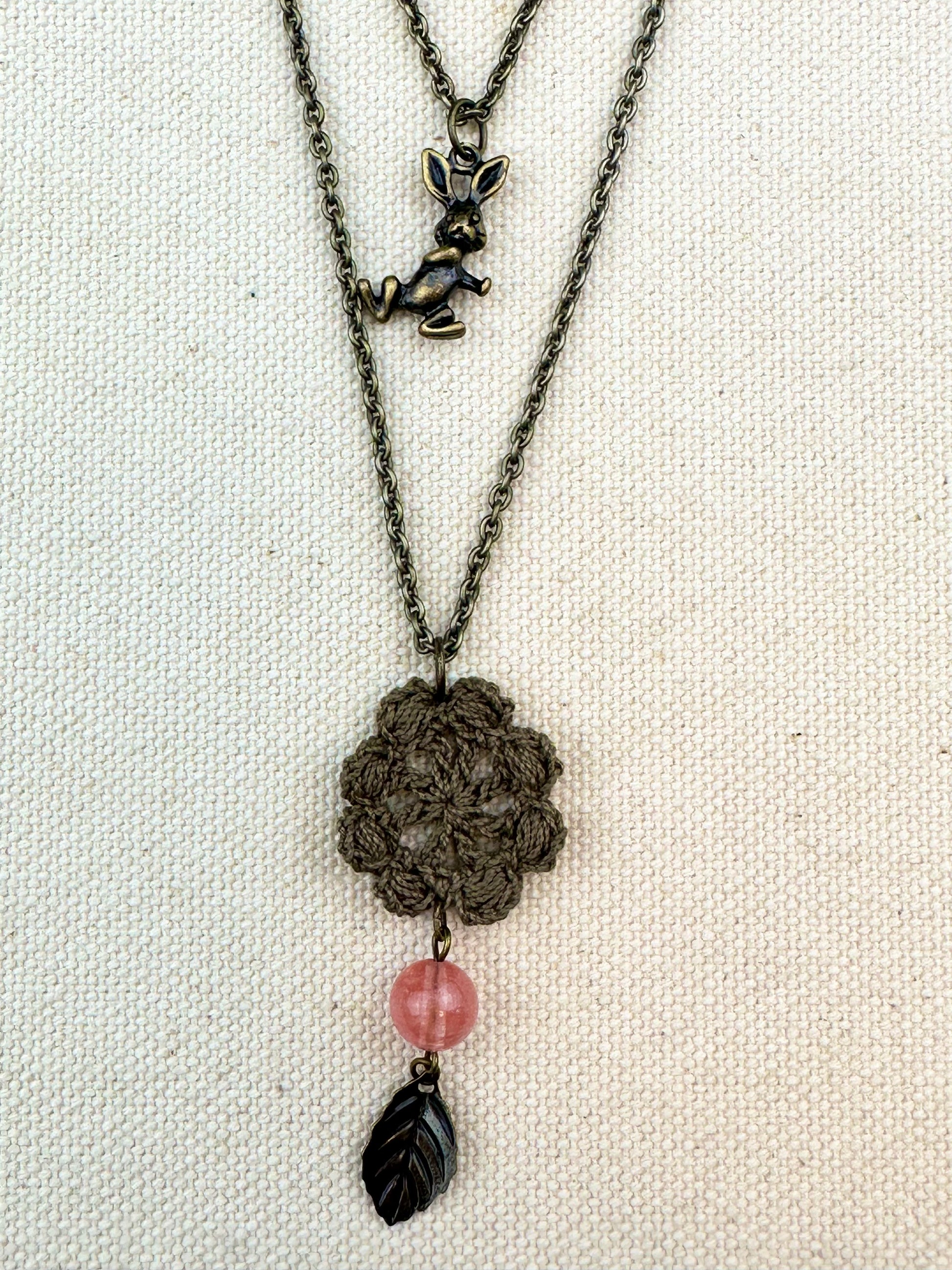 デュアルリング珈琲で染めたレースをあしらえたネックレスです。