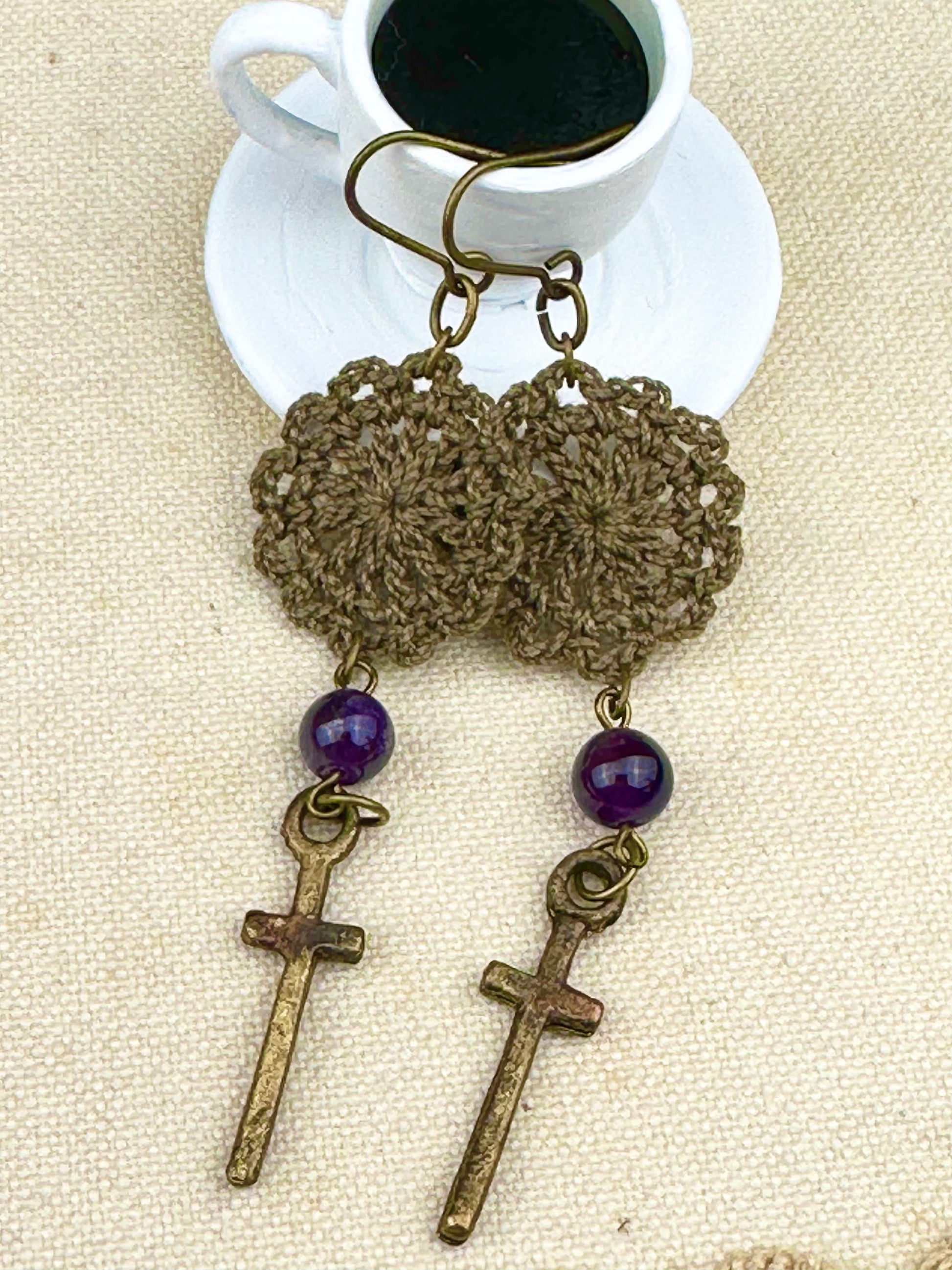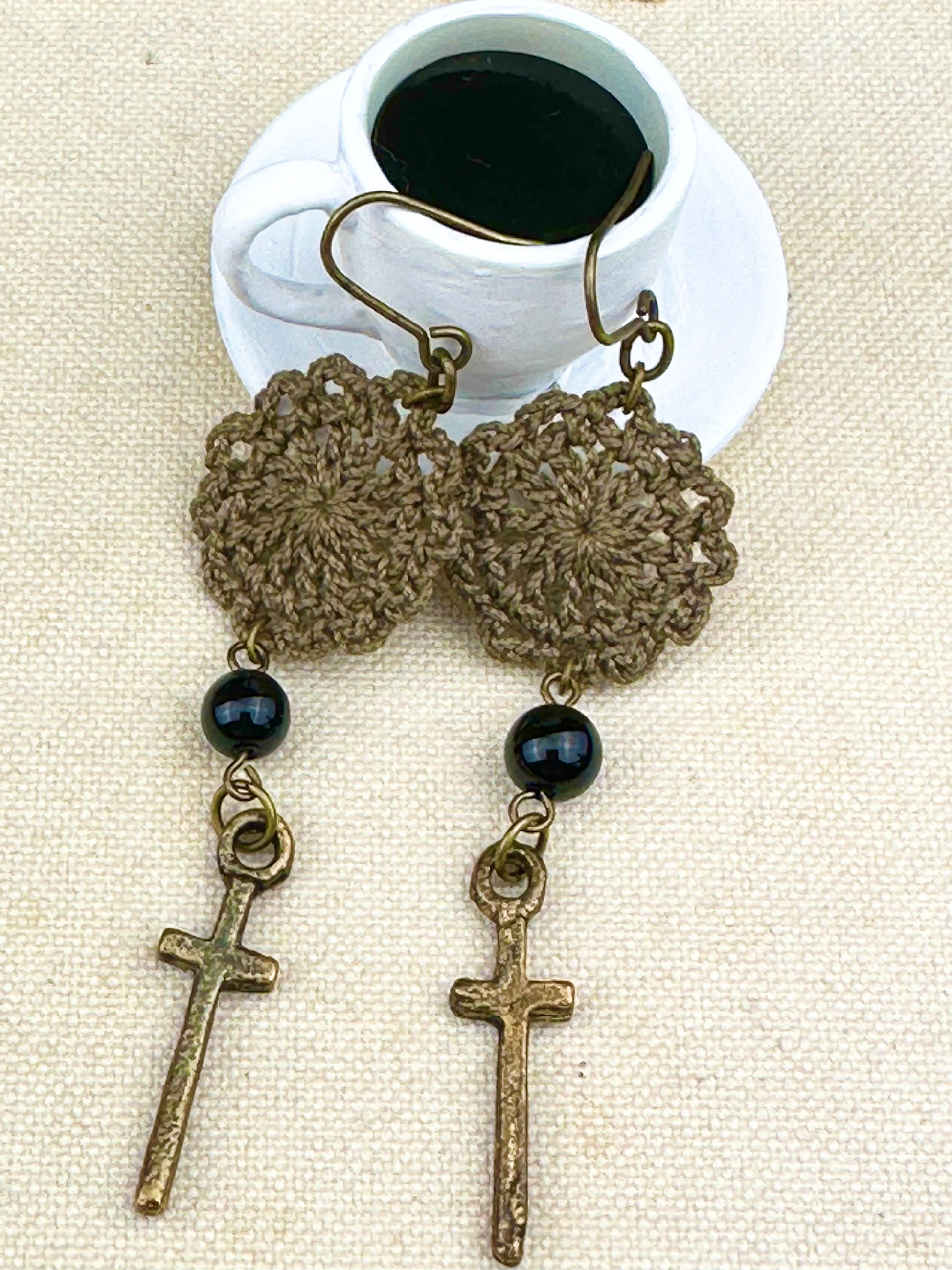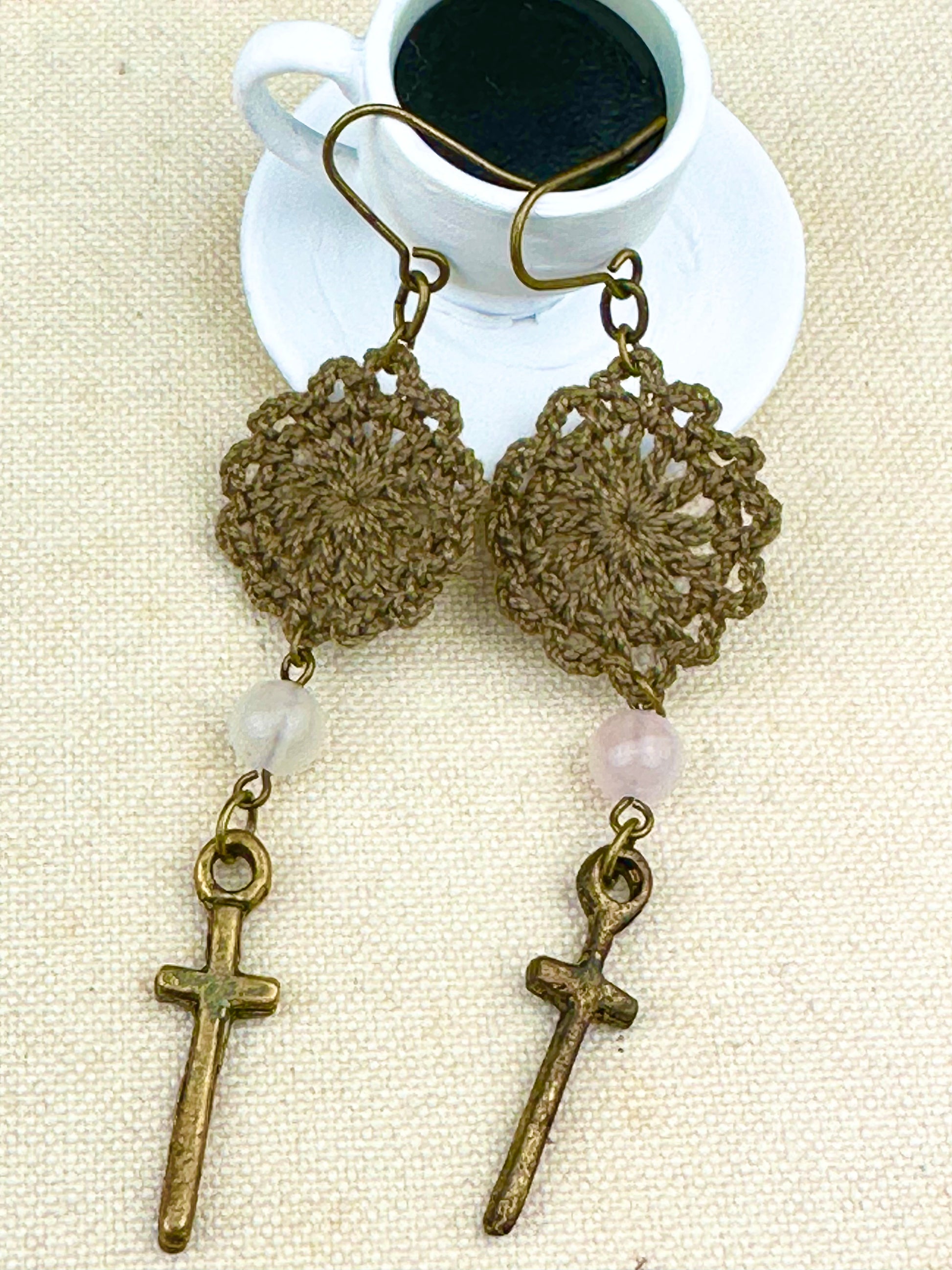 デュアルリング珈琲で染めたレースをあしらえたピアスです。